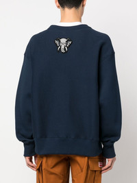 logo-applique crew-neck sweatshirt Animal motifs feature throughout Kenzo's collections, adding a playful spirit to their contemporary designs. Elevating the varsity style of this logo cotton sweatshirt, an elephant mascot is seen in an applique patch at the nape of the neck. Highlights - Navy blue/purple/white - Cotton - Jersey fleece - Applique logo to the front - Elephant patch to the rear - Ribbed detailing to the side - Crew neck - Drop shoulder - Long sleeves - Ribbed cuffs and hem Imported Composition Outer: Cotton 100% Lining: Cotton 98%, Elastane 2% SIZE & FIT Model measurements Height 6 ft 1 in(1.85 m) Bust/Chest 35.82 in(91 cm) Hips 37.79 in(96 cm) Waist 29.13 in(74 cm) Measurement CHEST 56.69 in(144 cm) SLEEVE LENGTH 24.4 in(62 cm) LENGTH 25.59 in(65 cm) FittingInformation This piece fits true to size. We recommend you get your regular size Cut for a loose fit Made with a mid-weight fabric Washing instructions Machine Wash