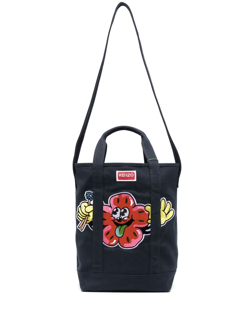 logo-patch tote bag This tote bag from KENZO finely demonstrates the brand's propensity for bold designs, thanks to the addition of playful prints to this navy blue accessory. Imported Composition Outer: Polyester 100%, Cotton 100% Lining: Calf Leather 100%, Cotton 100% SIZE & FIT Model measurements Height 5 ft 9 in(1.75 m) Bust/Chest 31.1 in(79 cm) Hips 33.46 in(85 cm) Waist 23.22 in(59 cm) Measurement DEPTH 6.29 in(16 cm) HANDLE 5.11 in(13 cm) HEIGHT 15.35 in(39 cm) STRAP 18.5 in(47 cm) WIDTH 15.74 in(40 cm)