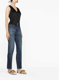 mid-rise straight jeans indigo blue cotton dark wash whiskering effect mid-rise straight leg front button and zip fastening classic five pockets Imported Composition Cotton 100% SIZE & FIT Model measurements Height 5 ft 10 in(1.77 m) Bust/Chest 31.49 in(80 cm) Hips 35.03 in(89 cm) Waist 23.22 in(59 cm) FittingInformation This piece fits true to size. We recommend you get your regular size Cut for a slim fit Made with a mid-weight non-stretch fabric Washing instructions Machine Wash
