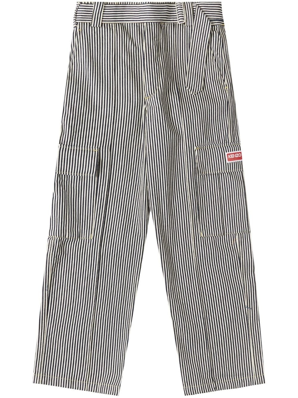 striped "Blue" straight trousers Highlights - Blue/white - Cotton - Vertical stripe pattern - Concealed fly and button fastening - Belted waist - Belt loops - Two side slash pockets - Applique logo - Two side cargo pockets - Two rear flap pockets - Straight leg Made in Italy Composition Cotton 100%
