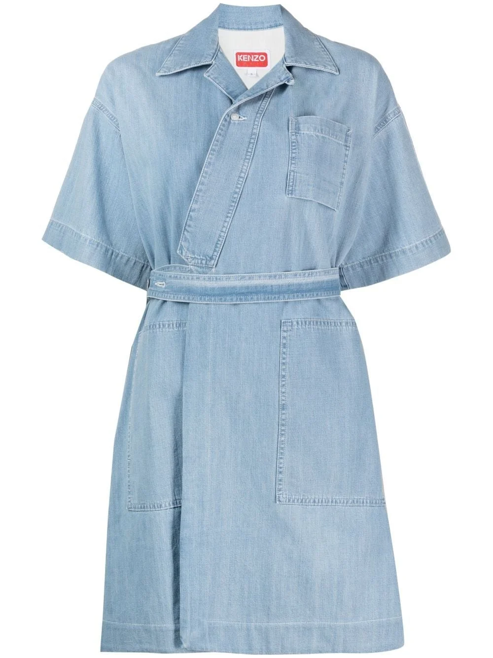 tied-waist denim wrap dress Kenzo borrows from workwear styles to create this denim wrap dress. Crafted in a light blue wash, the timeless silhouette features a tied waist and two spacious patch pockets that reflect the label's utilitarian influences. Imported Composition Cotton 100% SIZE & FIT Model measurements Height 5 ft 10 in(1.78 m) Bust/Chest 31.49 in(80 cm) Hips 36.22 in(92 cm) Waist 25.59 in(65 cm) FittingInformation This piece fits true to size. We recommend you get your regular size Cut for a loose fit Made with a mid-weight non-stretch fabric