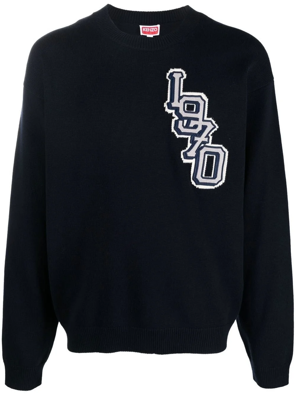Varsity logo knitted jumper Designed from a soft cotton and wool blend and taking inspiration from collegiate styles;, this knitted jumper from Kenzo is presented in a versatile blue hue and detailed with signature intarsia-knit logo embroideries at the chest and rear. Imported Composition Polyester 100%, Wool 55%, Cotton 45% SIZE & FIT Model measurements Height 6 ft 1 in(1.86 m) Bust/Chest 38.18 in(97 cm) Hips 38.18 in(97 cm) Waist 30.7 in(78 cm) FittingInformation This piece fits true to size. We recommend you get your regular size Cut for a relaxed fit Made with a mid-weight fabric Washing instructions Hand Wash