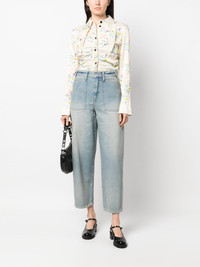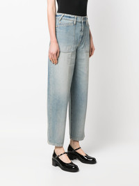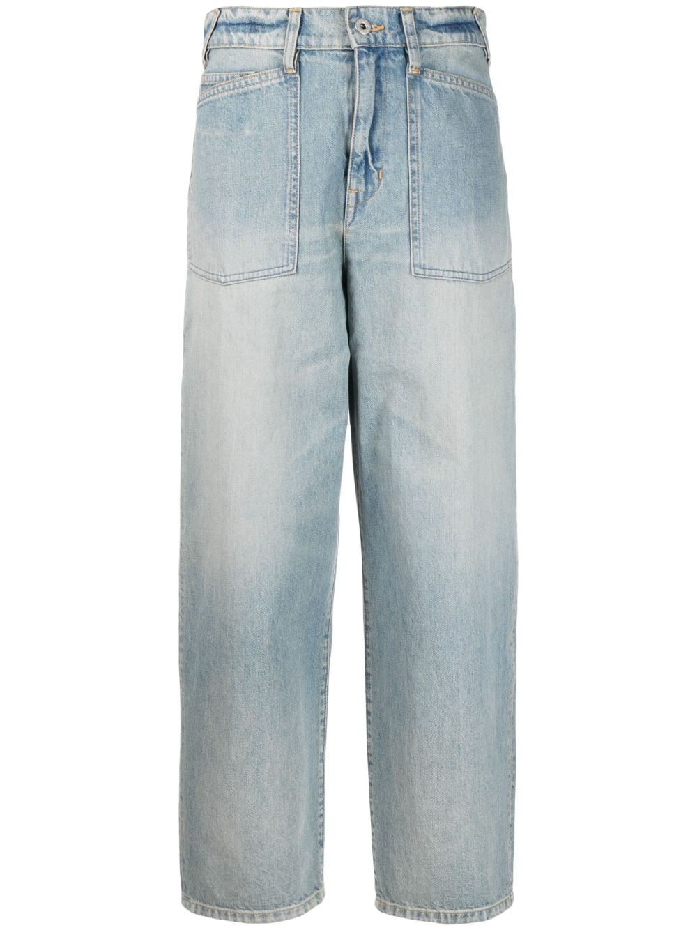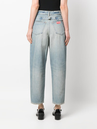 wide-leg cropped jeans These jeans celebrate Japanese Kaihara denim, a key element in KENZO's SS23 collection. The workwear-inspired design features large patch pockets on the front and a buckle at the back. Highlights - Blue - Cotton - Denim - Stonewashed - Logo patch to the rear - High waist - Belt loops - Button fly fastening - Rear buckle fastening - Frayed hem - Wide leg - Cropped leg Imported Composition Cotton 100% SIZE & FIT Model measurements Height 5 ft 10 in(1.78 m) Bust/Chest 31.49 in(80 cm) Hips 36.22 in(92 cm) Waist 25.59 in(65 cm) FittingInformation Designed for a straight-leg fit, these jeans allow for a close fit at the waist and an unrestricted and comfortable fit over the leg Sturdy and hard-wearing, this denim piece offers no stretch This piece fits true to size – take your usual size Washing instructions Machine Wash
