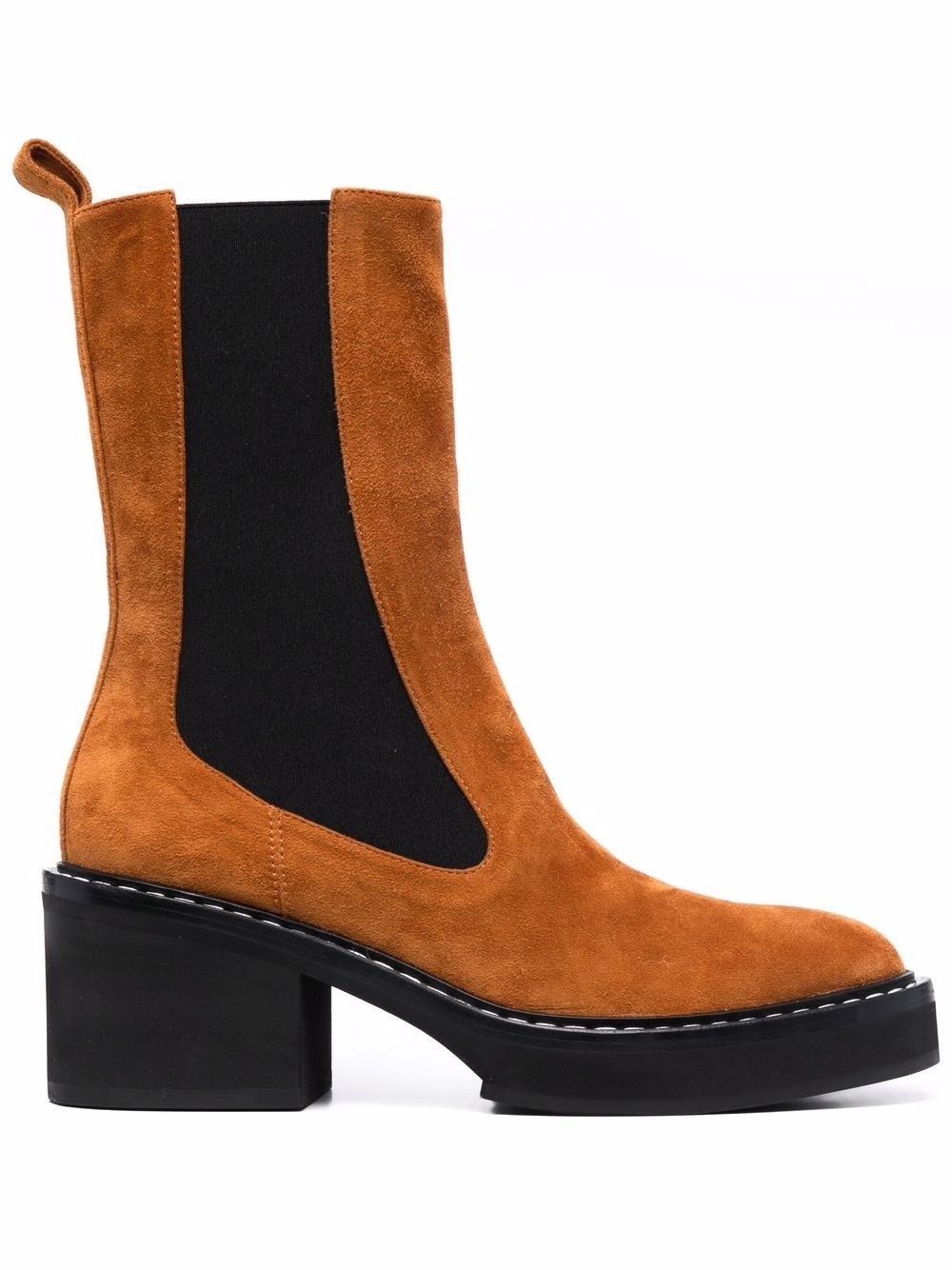 Calgary suede-leather boots Sat atop a wearable low block heel, KHAITE's The Calgary boots have been expertly crafted from suede and detailed with a subtle yet striking contrast stitching at the sole. The result is an equally comfortable and practical style - a common theme in the label's pre-fall 2021 collection. Highlights - Caramel - Leather - Elasticated side panels - Low block heel - Pull-tab at the heel - Round toe Made in Italy Composition Lining: Leather 100% Sole: Rubber 100% Outer: Leather 100% SIZE & FIT Measurement HEEL 2.75 in(7 cm) HEIGHT 8.66 in(22 cm) Sole height 1.18 in(3 cm)