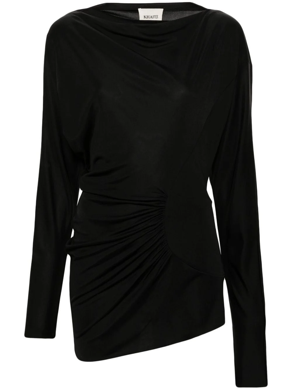 The Ciro ruched top Highlights - Black - Technical jersey - Slash neck - Long sleeves - Gathering at the hip - Asymmetric hem - Thigh-length Imported Composition Viscose 100% SIZE & FIT Model measurements Height 5 ft 11 in(1.8 m) Bust/Chest 32.67 in(83 cm) Hips 35.82 in(91 cm) Waist 24.8 in(63 cm) FittingInformation Designed for a loose fit at the chest with a close fit over the waist and hips Made from a midweight non-stretch fabric, this piece offers minimal elasticity when worn This piece fits true to size – take your usual size Washing instructions Dry Clean Only