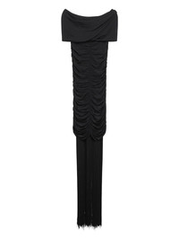 draped fringe dress Highlights - Black - Off-shoulder neckline - Draped bodice - Fringe trim Made in Italy Composition Viscose 95%, Polyamide 5% SIZE & FIT FittingInformation Designed for a close fit throughout Made from a midweight non-stretch fabric, this piece offers minimal elasticity when worn Washing instructions Read Manufacturer Guidelines