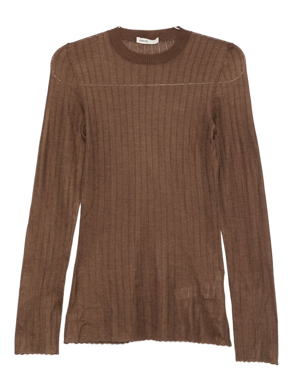 Elm top Highlights - Brown - Ribbed knit - Long sleeves - Round neck - Straight hem - Semi-sheer Made in Italy Composition Silk 81%, Cashmere 14%, Polyamide 4%, Polyurethane 1% SIZE & FIT Model measurements Height 5 ft 10 in(1.77 m) Bust/Chest 32.28 in(82 cm) Hips 35.03 in(89 cm) Waist 25.19 in(64 cm) Washing instructions Read Manufacturer Guidelines