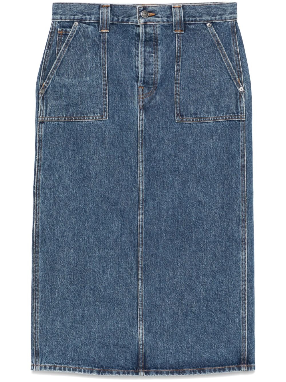 Genevieve midi skirt Highlights - Blue - Button fly fastening - Belt loops - Classic five pockets - Rear slit Made in United States Composition Cotton 100% SIZE & FIT Model measurements Height 5 ft 10 in(1.78 m) Bust/Chest 33.85 in(86 cm) Hips 36.61 in(93 cm) Waist 26.77 in(68 cm) Measurement HIPS 37.79 in(96 cm) LENGTH 32.28 in(82 cm) WAIST 30.7 in(78 cm) FittingInformation This midi-length skirt is intended to be worn just below the waist The vented hem offers movement at the rear Sturdy and hard-wearing, this denim piece offers no stretch