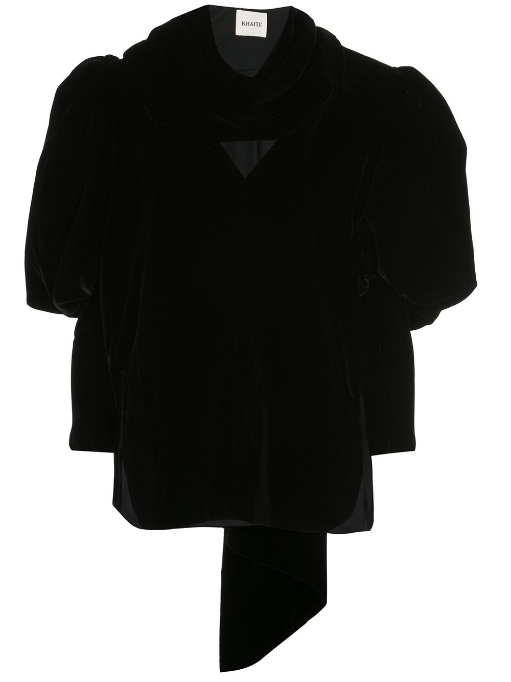 Jones silk velvet top Black Jones silk velvet top from Khaite featuring a plunging neck, a draped neckline, side slits, gigot sleeves and a scarf like neck tie. Imported Composition Silk 100%, Viscose 69%, Cupro 31% SIZE & FIT Model measurements Height 5 ft 10 in(1.77 m) Bust/Chest 31.88 in(81 cm) Hips 33.85 in(86 cm) Waist 24.01 in(61 cm) Measurement SLEEVE LENGTH 35.03 in(89 cm) Shoulder Width 14.96 in(38 cm) LENGTH 29.92 in(76 cm) WAIST 38.97 in(99 cm) BUST 37 in(94 cm) Washing instructions Dry Clean Only