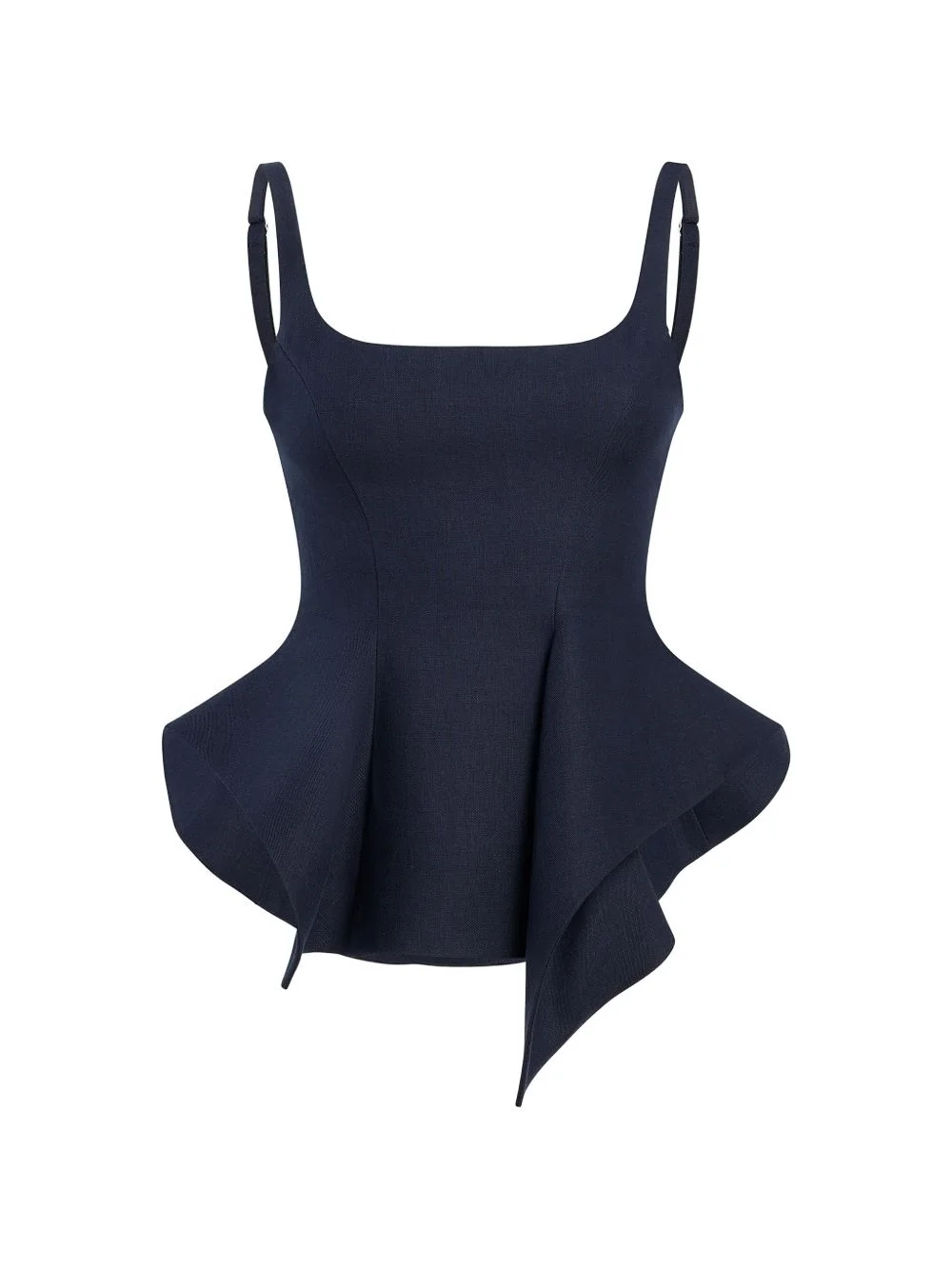 Loa top Highlights - A sleeveless peplum top tailored in linen suiting that is densely woven for a beautiful drape with reduced wrinkling. framed by adjustable straps and a scooped neckline, the silhouette is fitted at the bust, flaring from the waist into draped volume with a handkerchief hem. concealed zipper closure at back. lined in soft silk habotai. - Dark navy - Scoop neck - Draped Made in Italy Composition Linen/Flax 100% Washing instructions Dry Clean Only