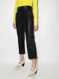 Melie cropped leather trousers A prime example of Khaite's focus on modern designs, these Melie trousers are from 100% leather. They're cut to a contemporary cropped leg and high waist. Made in United States Composition Lining: Silk 100% Outer: Leather 100% SIZE & FIT Model measurements Height 5 ft 9 in(1.76 m) Bust/Chest 32.28 in(82 cm) Hips 37.4 in(95 cm) Waist 25.59 in(65 cm) Measurement INSIDE LEG 23.62 in(60 cm) HIPS 38.58 in(98 cm) WAIST 29.13 in(74 cm) FittingInformation This piece fits true to size. We recommend you get your regular size Cut for a relaxed fit Made with a mid-weight fabric Washing instructions Specialist Cleaning