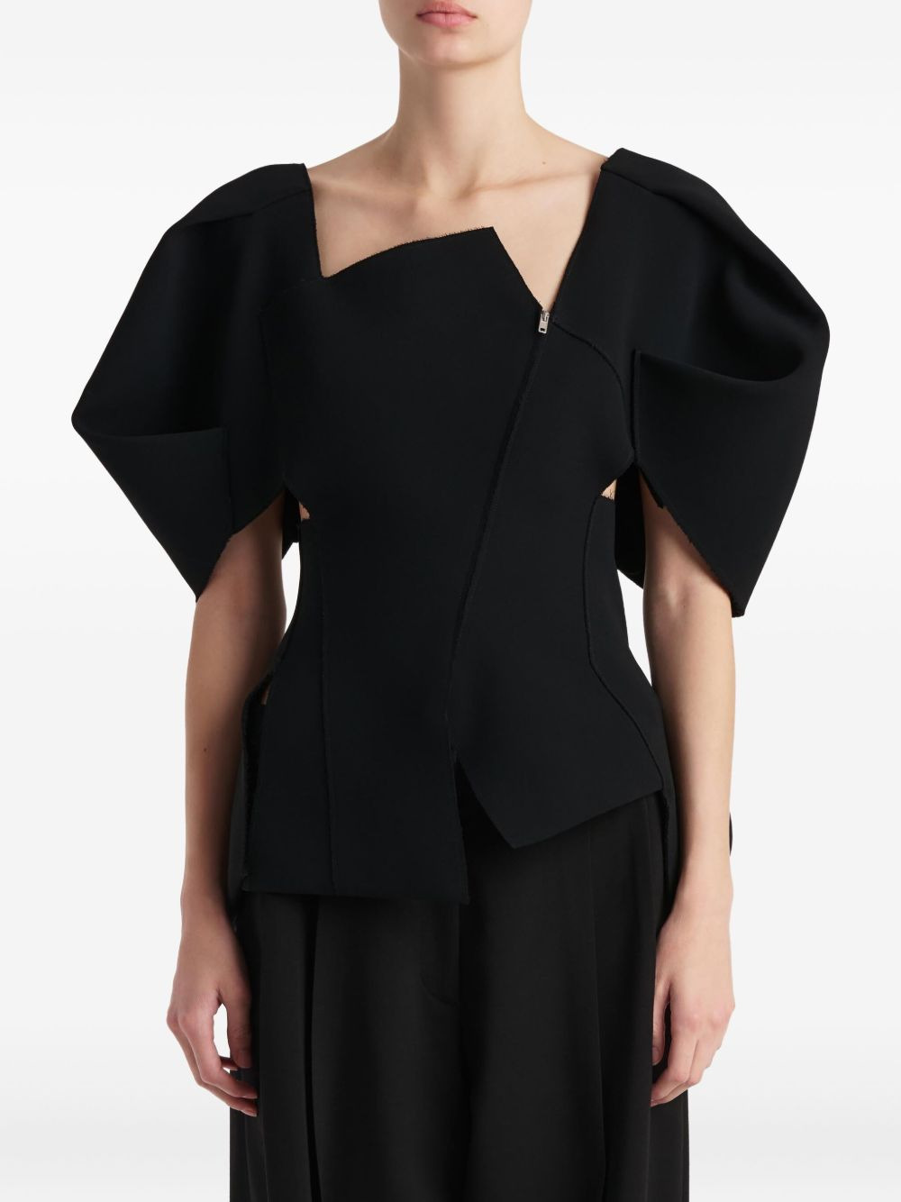 Quan top Highlights - Black - V-neck - Front zip fastening - Short sleeves Made in United States Composition Polyester 100% Washing instructions Read Manufacturer Guidelines
