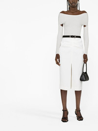 Salma off-shoulder ribbed top Spun in Italy from a delicate blend of wool, this silver-tone iteration of the Salma knitted top is elevated with a glittery finish throughout for added dimension and given a romantic appeal with an off-shoulder design. Complete with a cut-out at the rear, the silhouette seamlessly captures Khaite's understated yet sophisticated identity. Highlights - Light grey - Virgin wool blend - Knitted construction - Metallic threading - Off-shoulder - Fine ribbed - Cut-out detailing Made in Italy Composition Virgin Wool 38%, Polyester 36%, Metallic Fibre 17%, Polyamide 8%, Spandex/Elastane 1% SIZE & FIT Model measurements Height 5 ft 10 in(1.79 m) Bust/Chest 31.1 in(79 cm) Hips 35.03 in(89 cm) Waist 24.01 in(61 cm) FittingInformation This piece fits true to size. We recommend you get your regular size Cut for a close fit Made with a mid-weight stretch fabric