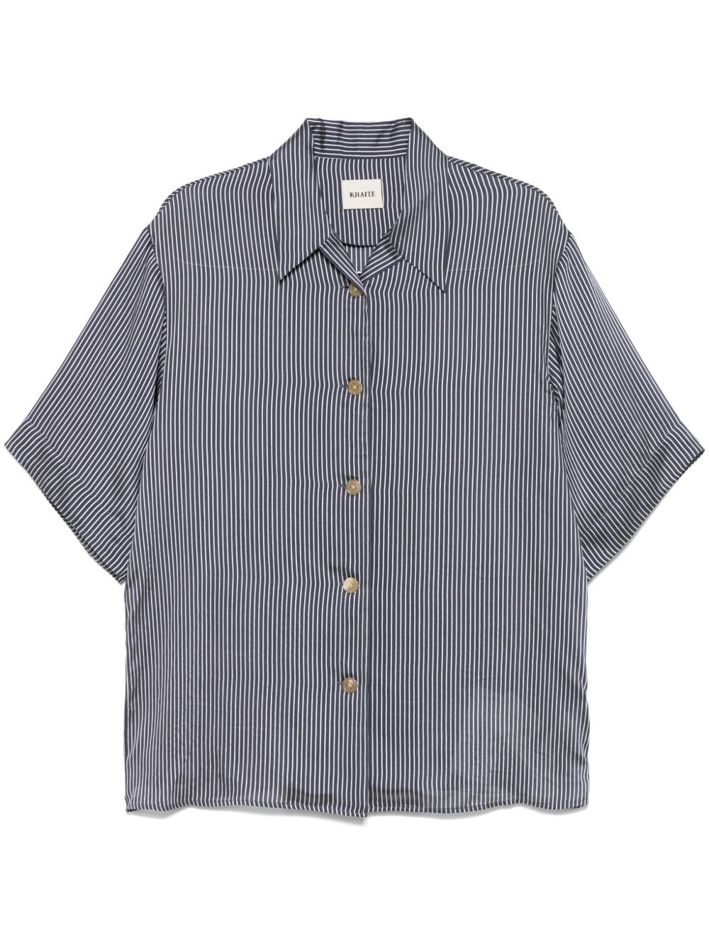 striped shirt Highlights - Navy blue - Front button fastening - Straight-point collar - Drop shoulder - Half-length sleeves Made in United States Composition Viscose 86%, Silk 14% SIZE & FIT Model measurements Height 5 ft 10 in(1.77 m) Bust/Chest 33.07 in(84 cm) Hips 37 in(94 cm) Waist 24.8 in(63 cm) FittingInformation Designed to be unstructured, offering a loose fit throughout Made from a midweight non-stretch fabric