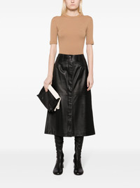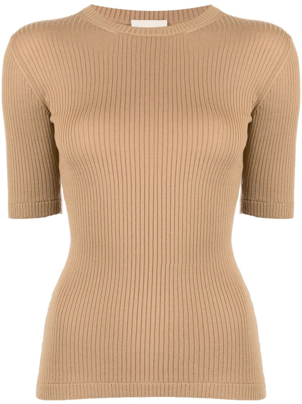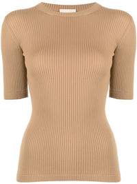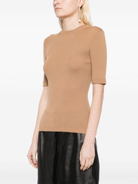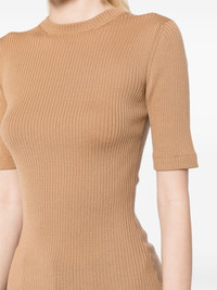 The Ange rib-knit top This brown top by KHAITE showcases the brand's unrivalled expertise in knitwear. It boasts a sophisticated monochromatic design that is accentuated by variegated ribbing and further enriched with tubular finishing at the armholes and hem. Highlights - Light brown - Wool blend - Ribbed detailing - Crew neck - Short sleeves - Straight hem Made in Italy Composition Wool 97%, Polyamide 2%, Polyurethane 1% SIZE & FIT Model measurements Height 5 ft 9 in(1.76 m) Bust/Chest 31.1 in(79 cm) Hips 35.03 in(89 cm) Waist 24.4 in(62 cm) FittingInformation Designed for a close fit throughout Made with a lightweight knit, this piece offers some stretch This piece fits small – take one size up. If you have a fuller chest you may wish to take a further size up Washing instructions Dry Clean Only