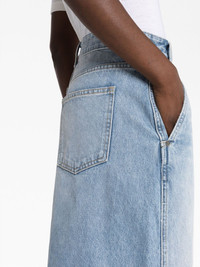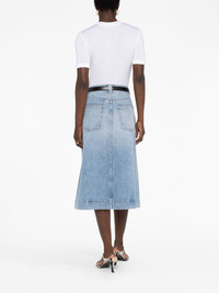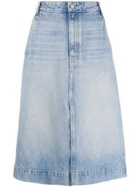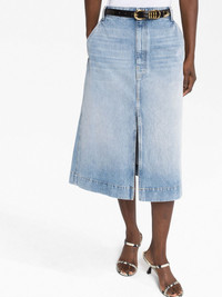 The Charlene denim skirt Khaite’s The Charlene skirt is designed with the label’s refined and timeless air. Cut from rigid cotton with a front split to enhance the clean and classic A-line silhouette, it debuts the custom Bryce wash for the perfect faded finish. Highlights - Light blue - Cotton - Low-rise - Front button and zip fastening - Belt loops - Two side slit pockets - Front slit - Two rear patch pockets - A-line - Mid-length Made in United States Composition Cotton 100% SIZE & FIT Model measurements Height 5 ft 10 in(1.77 m) Bust/Chest 32.28 in(82 cm) Hips 35.03 in(89 cm) Waist 25.19 in(64 cm) Measurement HIPS 44.09 in(112 cm) LENGTH 30.7 in(78 cm) WAIST 33.07 in(84 cm) Washing instructions Hand Wash
