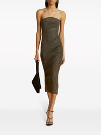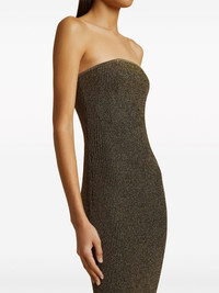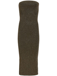 The Rumer ribbed-knit midi dress Highlights - Olive green/gold-tone - Stretch-design - Metallic threading - Ribbed knit - High-shine detailing - Round neck - Strapless - Sleeveless - Fitted waistline - Rear slit - Mid-length - Straight hem Made in Italy Composition Virgin Wool 46%, Polyester 30%, Metallic Fibre 14%, Polyamide 9%, Spandex/Elastane 1% SIZE & FIT Measurement HIPS 27.55 in(70 cm) LENGTH 37.79 in(96 cm) WAIST 25.59 in(65 cm) BUST 25.98 in(66 cm)