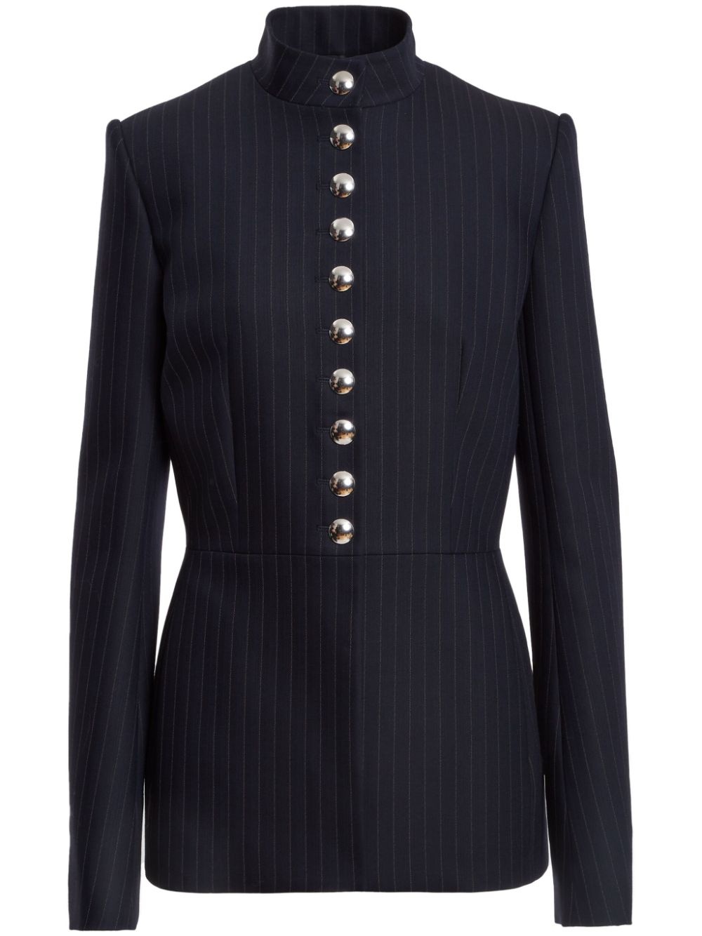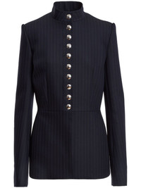 The Samuel pinstriped jacket Highlights - Navy blue - Virgin wool - Pinstripe pattern - Stand-up collar - Front button fastening - Shoulder pads - Long sleeves - Buttoned cuffs - Fitted waistline - Straight hem Made in United States Composition Lining: Cupro 100% Outer: Virgin Wool 100% SIZE & FIT Measurement SLEEVE LENGTH 26.37 in(67 cm) LENGTH 27.16 in(69 cm) WAIST 31.1 in(79 cm)