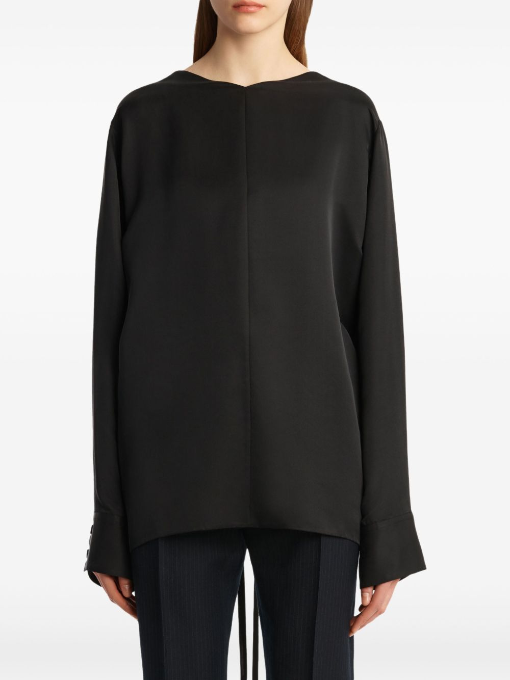 tie-back long-sleeve top Highlights - Black - Long sleeves - Tie fastening - Wide cuffs - Back opening Made in United States Composition Cupro 69%, Silk 31% Washing instructions Read Manufacturer Guidelines