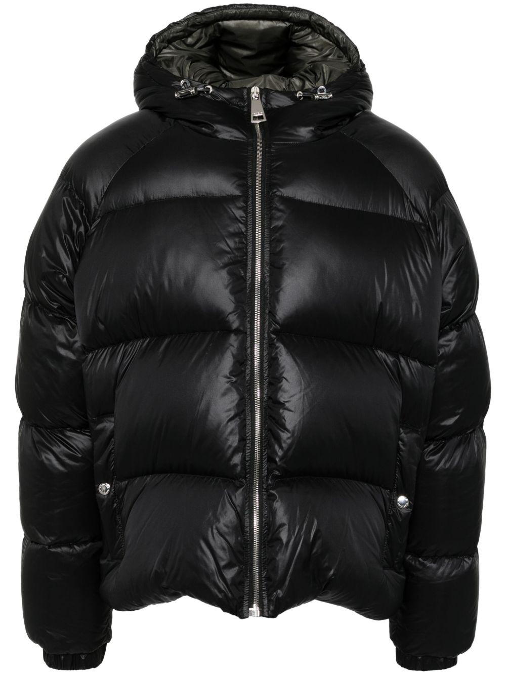 hooded padded jacket Highlights - Black - Front zip fastening - Two press-stud fastening side pockets - Drawstring hem - Elasticated cuffs Made in Italy Composition Lining: Polyamide 100% Duck Down 90%, Duck Feathers 10% Outer: Polyamide 100% SIZE & FIT Model measurements Height 6 ft 2 in(1.87 m) Bust/Chest 33.07 in(84 cm) Hips 35.43 in(90 cm) Waist 26.77 in(68 cm) FittingInformation Designed for a boxy fit, intended for a loose fit throughout The internal drawstring at the hem allows for fitted preferences Made from a padded non-stretch fabric, giving it no natural elasticity