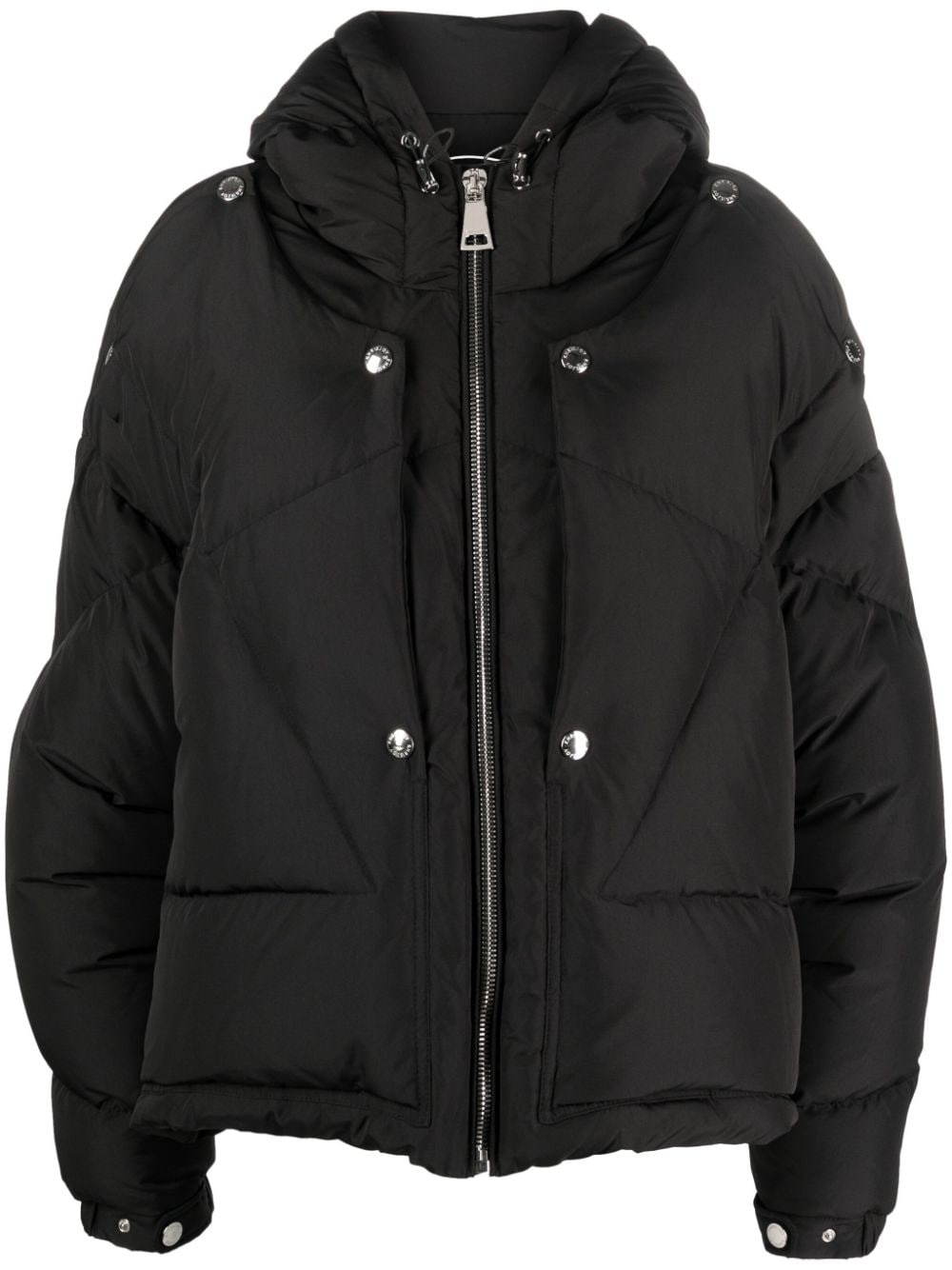hooded zip-up padded jacket Highlights - Black - Down-feather filling - Padded design - Press-stud fastening - Front zip fastening - Drawstring hood - Long sleeves - Straight hem Made in Italy Composition Lining: Polyester 100%, Down 80%, Feather 20% Outer: Polyester 100% SIZE & FIT Model measurements Height 5 ft 10 in(1.77 m) Bust/Chest 32.28 in(82 cm) Hips 35.03 in(89 cm) Waist 25.19 in(64 cm) FittingInformation Designed to be unstructured, offering a loose fit throughout The internal drawstring at the hem allows for fitted preferences Made from a padded non-stretch fabric, giving it no natural elasticity This piece fits true to size – take your usual size Washing instructions Hand Wash