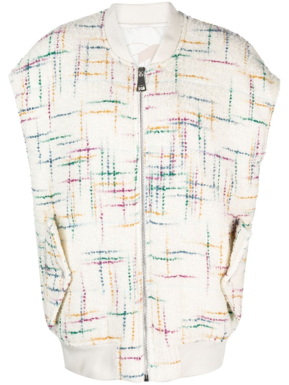 oversized tweed bomber jacket Highlights - Milk white/multicolour - Wool-cotton blend - Tweed - Embroidered logo to the rear - Band collar - Front zip fastening - Sleeveless - Two side flap pockets - Ribbed hem Made in Italy Composition Outer: Wool 43%, Polyester 21%, Acrylic 16%, Viscose 12%, Cotton 7%, Polyamide 1% Lining: Polyester 100% SIZE & FIT Model measurements Height 5 ft 10 in(1.78 m) Bust/Chest 32.67 in(83 cm) Hips 35.43 in(90 cm) Waist 23.22 in(59 cm) FittingInformation Designed for an oversized fit, offering additional room throughout The ribbed hem offers a close, comfortable fit Made from a padded non-stretch fabric, giving it no natural elasticity This piece fits true to size – take your usual size Washing instructions Dry Clean Only