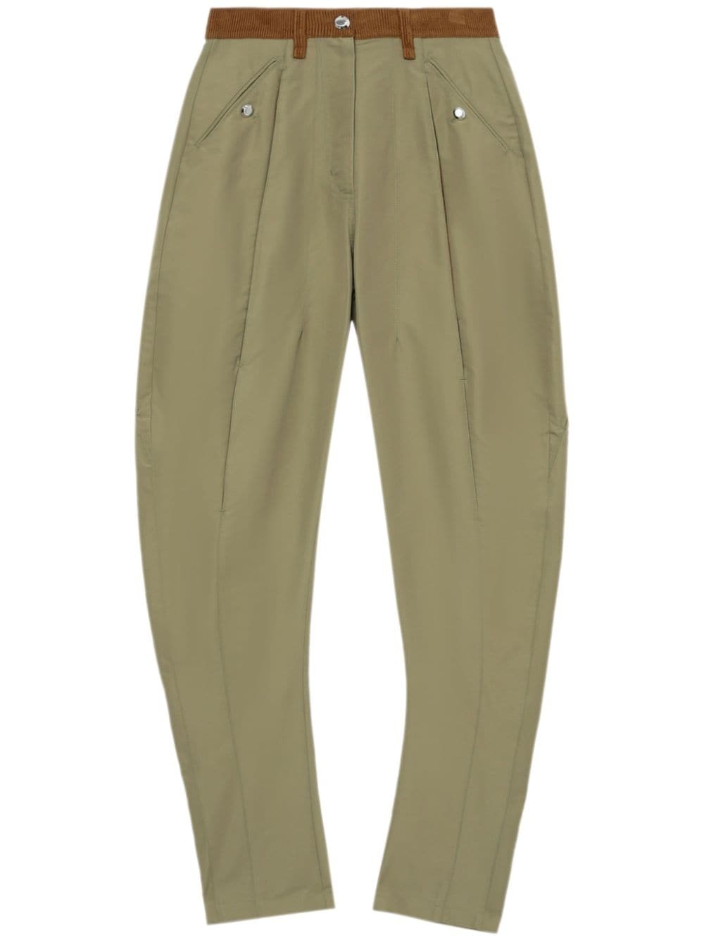 pleat-detailing tapered trousers Highlights - Olive green/brown - Cotton blend - Corduroy detail - Front button fastening - Belt loops - Two front jetted pockets - Rear zip-fastening pocket - Tapered leg Imported Composition Cotton 57%, Polyamide 43%