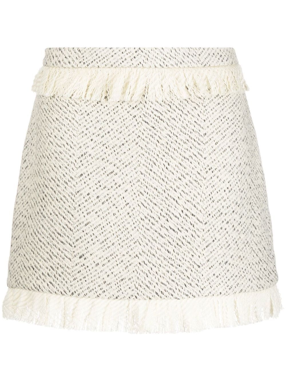 fringe-detail tweed mini skirt light grey wool-cashmere blend tweed fringe detailing high-waisted straight hem thigh-high Imported Composition Outer: Cashmere 100%, Wool 100% Lining: Polyester 50%, Cupro 50% SIZE & FIT Model measurements Height 5 ft 9 in(1.76 m) Bust/Chest 29.13 in(74 cm) Hips 33.07 in(84 cm) Waist 22.83 in(58 cm) FittingInformation This piece fits true to size. We recommend you get your regular size Designed to be fitted at the waist, loose over the leg Made with a mid-weight non-stretch fabric