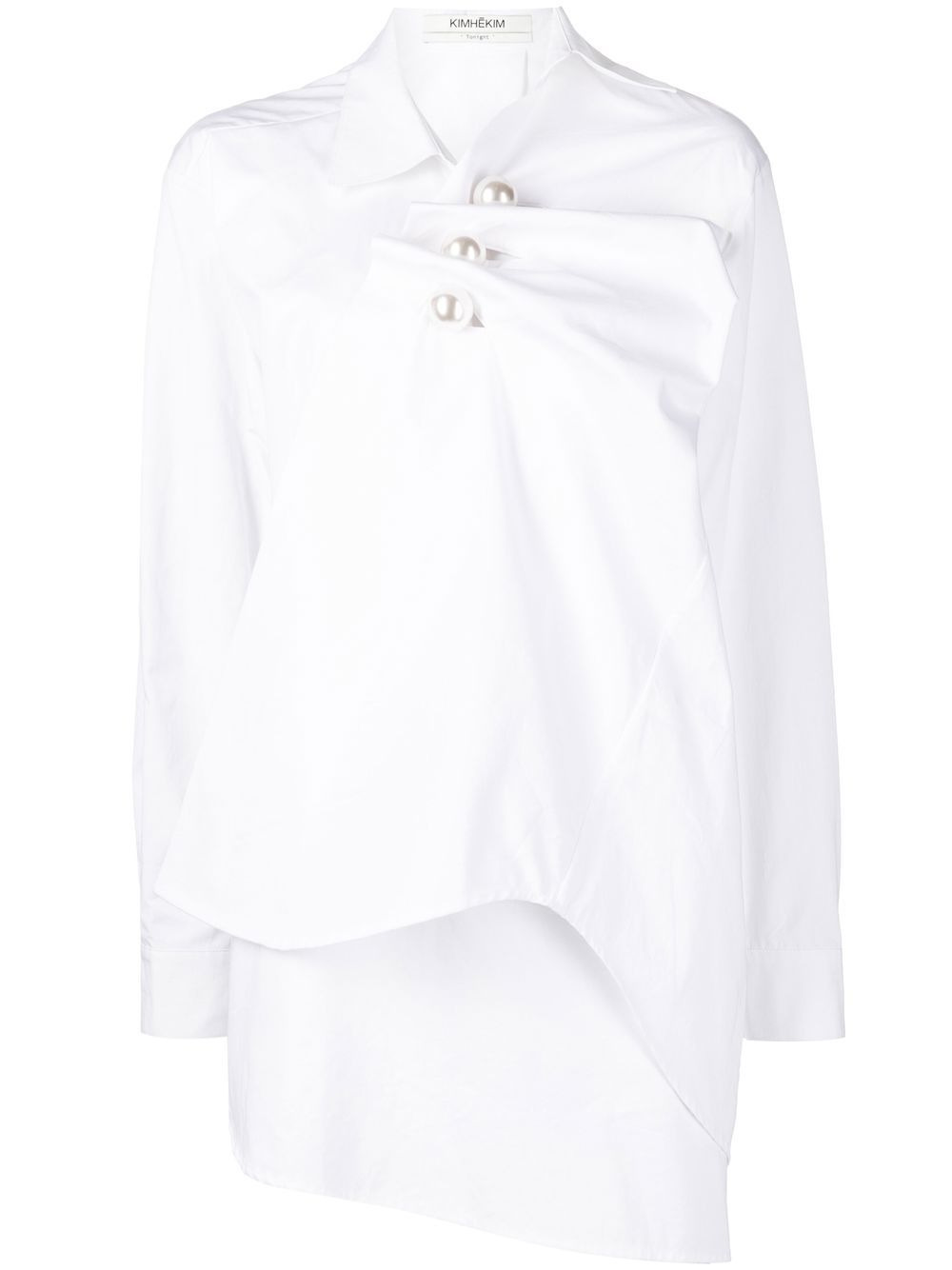 gathered asymmetric shirt white cotton asymmetric design gathered detailing front button fastening spread collar long sleeves Imported Composition Cotton 100% SIZE & FIT Model measurements Height 5 ft 10 in(1.77 m) Bust/Chest 31.49 in(80 cm) Hips 35.43 in(90 cm) Waist 25.19 in(64 cm) FittingInformation This piece fits true to size. We recommend you get your regular size Cut for a loose fit Made with a mid-weight non-stretch fabric