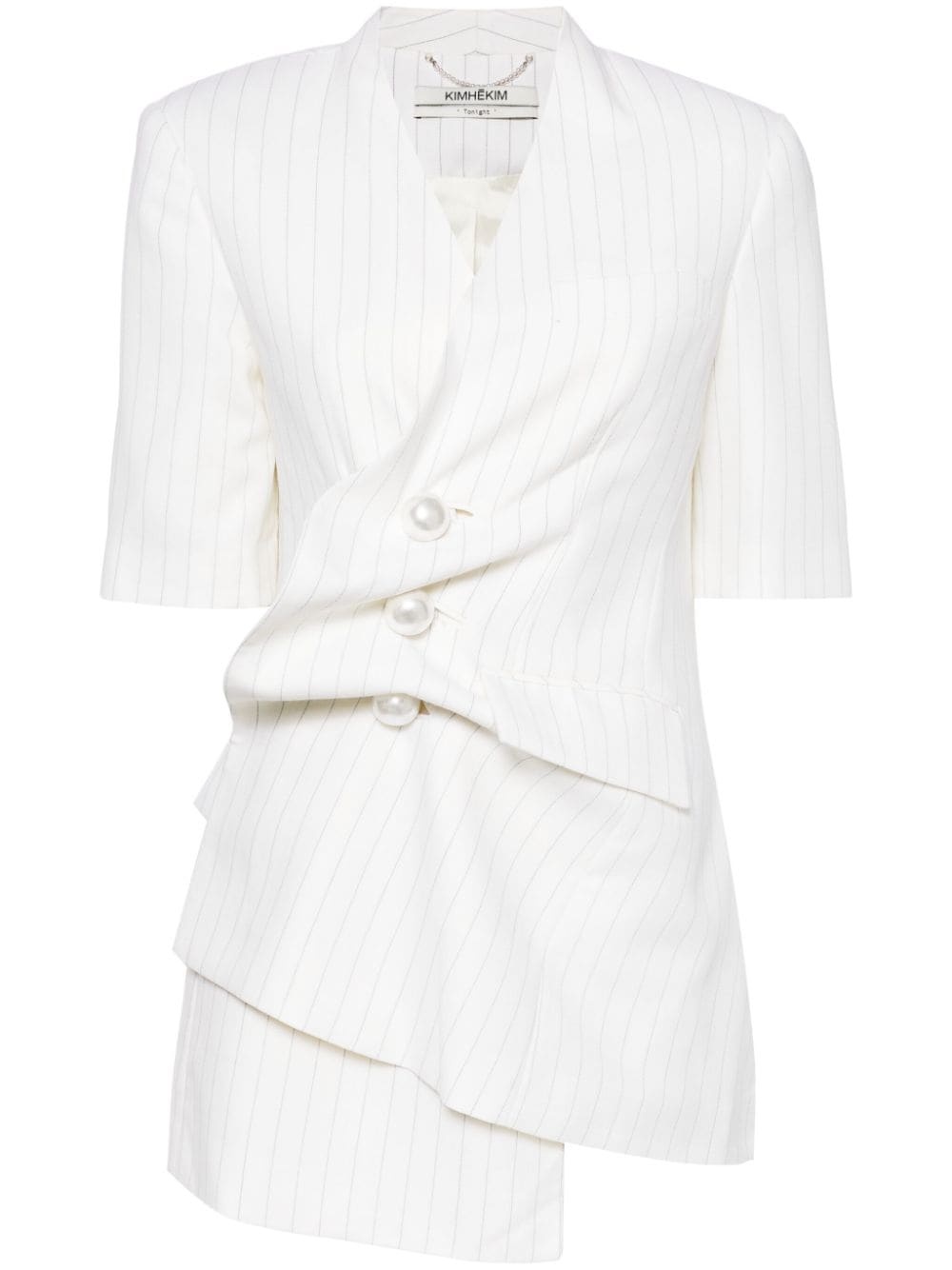 gathered short-sleeved blazer Highlights - Ivory white - Wool - Pinstripe print - Crossover neck - Gathered detailing - Faux-pearl buttons - Short sleeves - Asymmetric hem - English rear vents Imported Composition Outer: Wool 100% Lining: Polyester 100% SIZE & FIT Model measurements Height 5 ft 9 in(1.76 m) Bust/Chest 31.1 in(79 cm) Hips 35.03 in(89 cm) Waist 24.4 in(62 cm) FittingInformation Designed to be unstructured, offering a loose fit throughout The vented hem offers movement at the rear Made from a midweight non-stretch fabric This piece fits true to size – take your usual size
