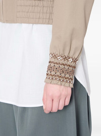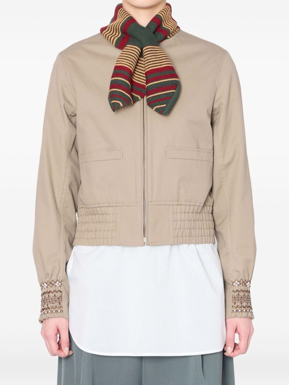 beaded-cuff cropped jacket Highlights - Beige - Elasticated waistband - Beaded embellishment - Striped knitted scarf - Front zip fastening - Long sleeves Imported Composition Cotton 100% Washing instructions Read Manufacturer Guidelines