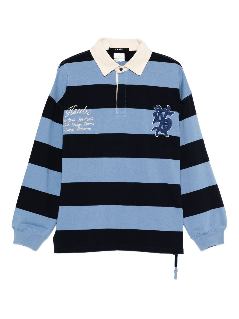 striped rugby sweater Highlights - Blue - Embroidered logo - Long sleeves - Polo collar Imported Composition Cotton 100% Washing instructions Read Manufacturer Guidelines