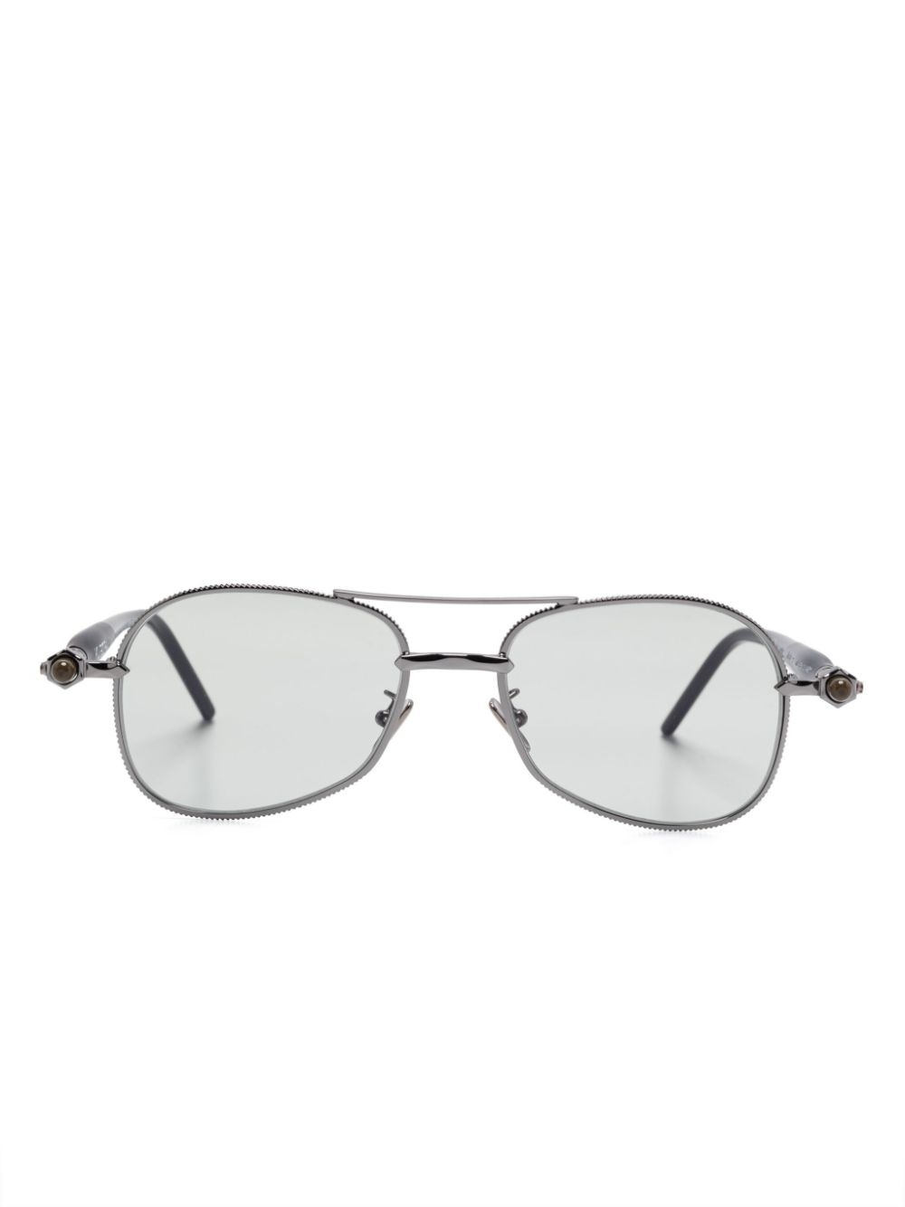 P75 sunglasses Highlights - Anthracite grey - Pilot frame - Grey tinted lenses - Uv-protective lenses - Straight arms - Curved tips - Nose pads Made in Italy Composition Acetate 100%, Metal 100% SIZE & FIT Measurement Arm Length 5.7 in(14.5 cm) Bridge Width 0.7 in(1.8 cm) Lens Diameter 2.16 in(5.5 cm) Total Width 5.9 in(15 cm)