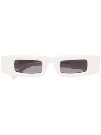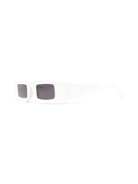 square frame sunglasses bright white square frame tinted lenses straight arms oversize arms curved tips These glasses come with a protective case. Made In Italy Composition Acetate 100% SIZE & FIT Measurement Arm Length 5.7 in(14.5 cm) Bridge Width 1.1 in(2.8 cm) Lens Diameter 1.88 in(4.8 cm) Total Width 6.69 in(17 cm)