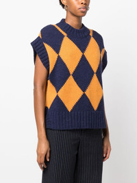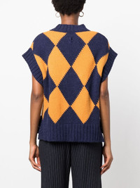 argyle intarsia-knit vest navy blue/mustard yellow knitted construction argyle intarsia knit ribbed-knit edge crew neck cap sleeves side slits straight hem Made in Italy Composition Alpaca 48%, Polyacrylic 36%, Polyamide 9%, Polyester 7% SIZE & FIT Model measurements Height 5 ft 11 in(1.8 m) Bust/Chest 31.88 in(81 cm) Hips 35.03 in(89 cm) Waist 24.01 in(61 cm) Washing instructions Machine Wash