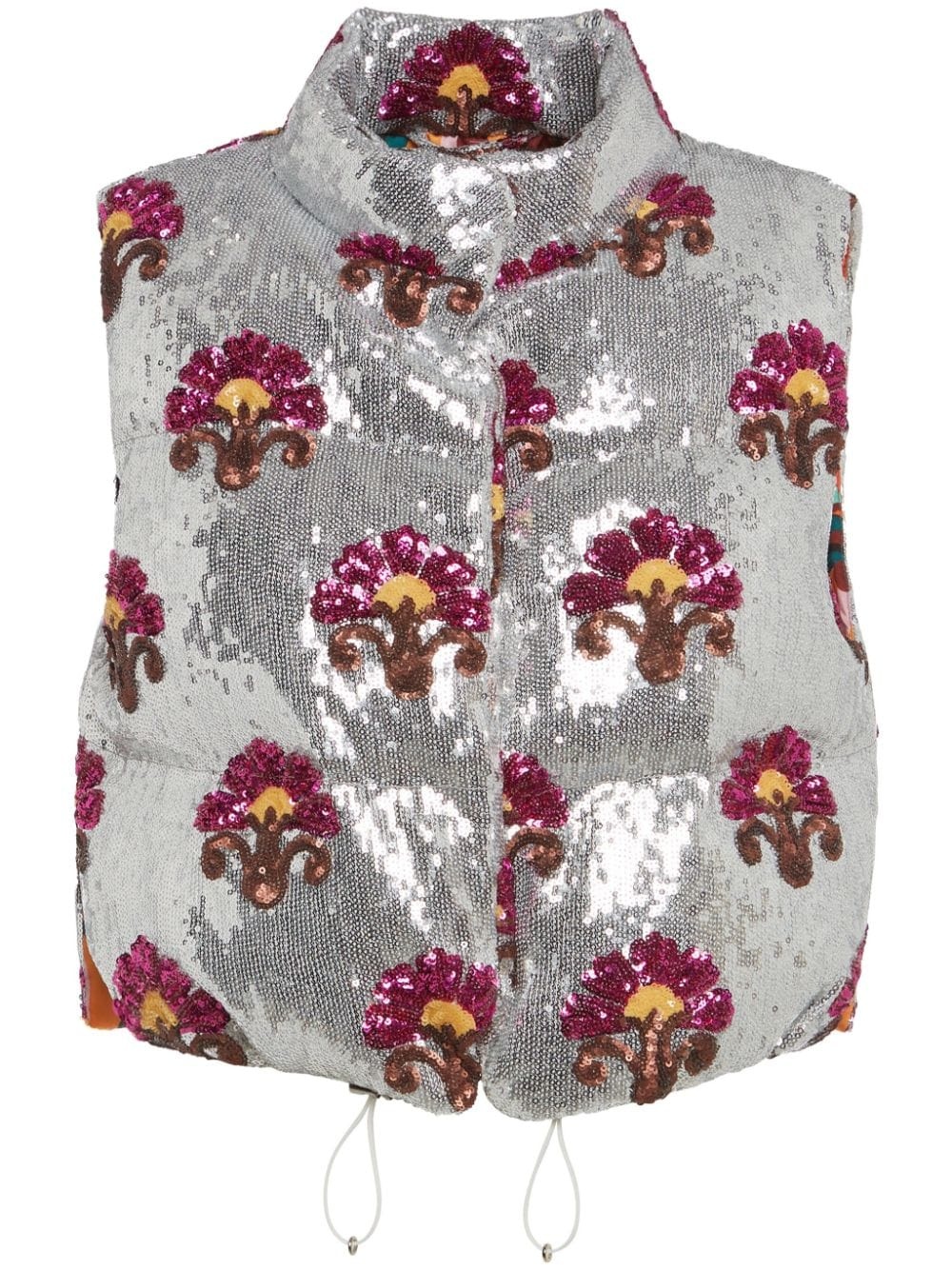 Bonbon sequin-embellished gilet Highlights - Silver-tone/multicolour - Sequin embellishment - Embroidered motif - High neck - Concealed front fastening - Sleeveless - Drawstring hem Made in Italy Composition Polyester 99%, Elastane 1%