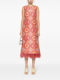 Column feathered midi dress Highlights - Carrot orange/multicolour - Cloque effect - All-over graphic patterned jacquard - Round neck - Sleeveless - Calf-length - Straight hem - Ostrich feather detailing - Contrast lining - Concealed rear zip fastening Made in Italy Composition Outer: Polyester 70%, Cotton 21%, Silk 4%, Polyamide 3%, Ostrich Feather 2% Lining: Polyester 100% SIZE & FIT Model measurements Height 5 ft 11 in(1.8 m) Bust/Chest 33.07 in(84 cm) Hips 37 in(94 cm) Waist 25.59 in(65 cm) FittingInformation Designed for a slim fit that sits just away from the body offering a close yet comfortable fit Made from a midweight non-stretch fabric This piece fits true to size – take your usual size Washing instructions Dry Clean Only