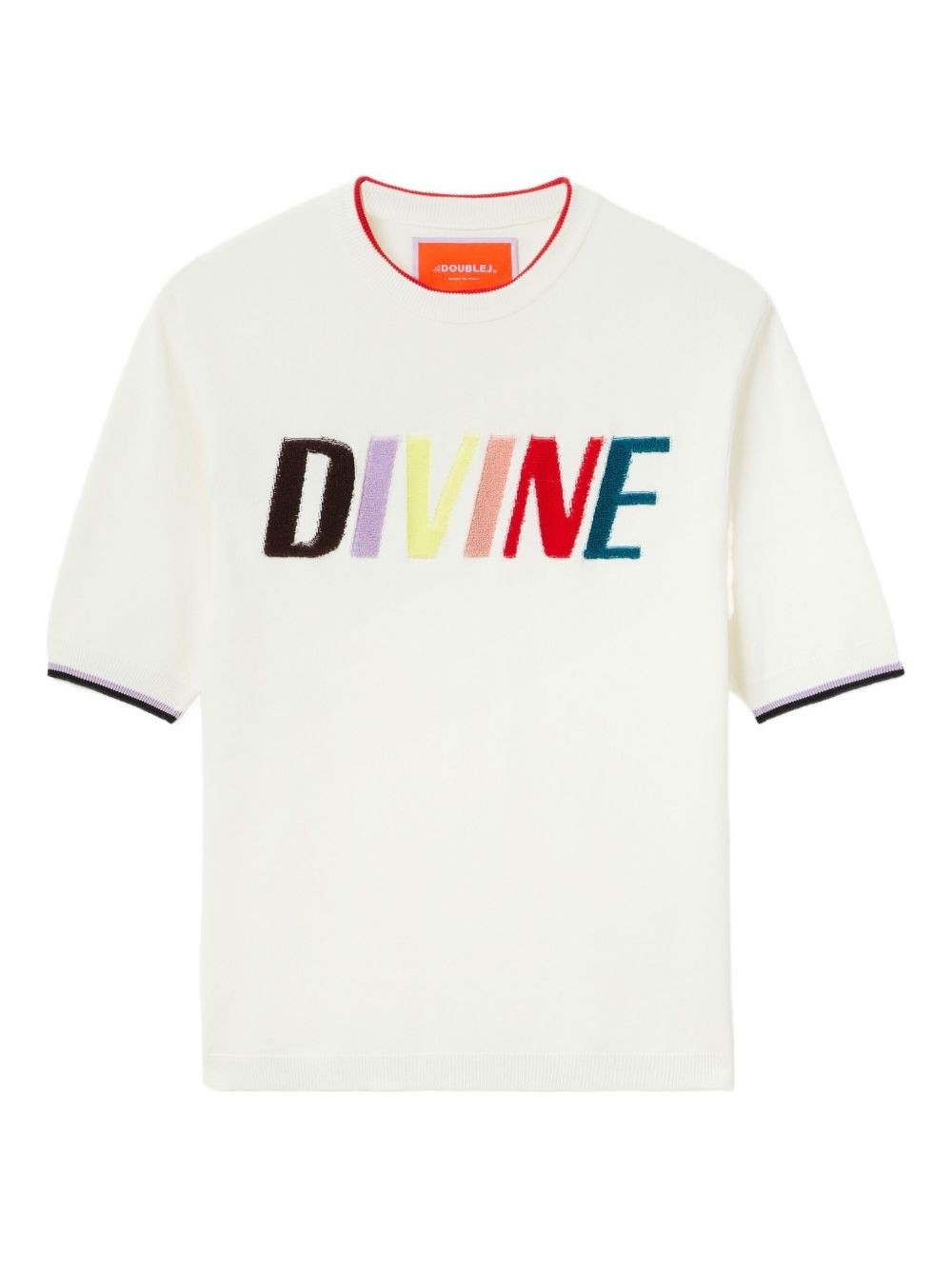 Divine embroidered T-shirt Highlights - Off-white - Short sleeves - Embroidered lettering - Ribbed cuffs Made in Italy Composition Viscose 88%, Cotton 8%, Polyester 4% Washing instructions Read Manufacturer Guidelines