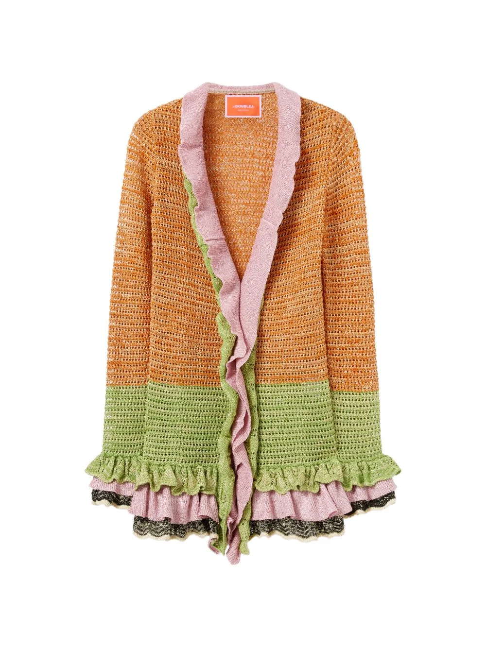 Eight Counts cardigan Highlights - Your cardigan collection just met its maximalist match: the eight counts cardigan. this is not just a layer; it's a vibrant, wearable masterpiece of italian artistry. crafted with an intricate openwork construction reminiscent of handcrafted crochet, its luxurious, substantial knit feels both vintage-inspired and utterly modern. but the true drama unfolds along the edges, where multiple ruched layers of shimmering ribbed lurex ruffles—alternated with delicate lace inserts—create a bold, color-blocked symphony of textures. it’s a high-vibe statement piece that promises to effortlessly elevate everything from your favorite jeans to a flowing silk dress, ensuring every entrance (and exit!) is nothing short of spectacular. - Garment fit: fitted - Cotton-viscose blend - 45% cotton 38% viscose 12% metal polyester 5% polyamide - Unlined - Made in italy - Openwork construction reminiscent of handcrafted crochet - Edges embellished with multiple rouche layers of ribbed lurex ruffles, alternated with lace inserts, arranged in bold color block compositions - 5 gauge Made in Italy Composition Cotton 45%, Viscose 38%, Metallized Polyester 12%, Polyamide 5% Washing instructions Read Manufacturer Guidelines