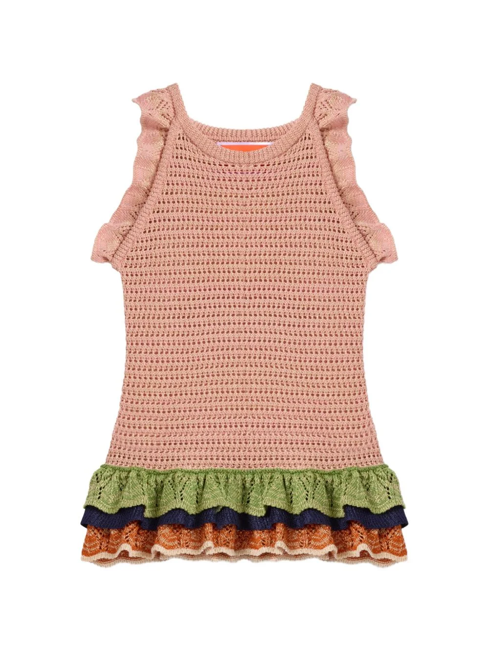 Eight Counts crop top Highlights - Make every move count with this super cute crop! this fitted beauty is a celebration of artisanal craftsmanship and high-vibe style, designed to be your favorite statement piece for the party season and beyond. crafted with an exquisite openwork construction that evokes the charm of handcrafted crochet, this cotton-viscose blend is infused with shimmering lurex, promising an irresistible sparkle. the edges arrive lavishly embellished with multiple ruched layers of ribbed lurex ruffles, boldly alternated with delicate lace inserts in eye-catching color block compositions. we love it with high-waisted skirts or pants, but whatever you wear it with, it's pretty much guaranteed to deliver major joy. - Garment fit: fitted - Cotton viscose blend - 43% cotton 39% viscose 12% metal polyester 6% polyamide - Unlined - Made in italy - Openwork construction reminiscent of handcrafted crochet - Edges embellished with multiple rouche layers of ribbed lurex ruffles, alternated with lace inserts, arranged in bold color block compositions - 5 gauge Made in Italy Composition Cotton 43%, Viscose 39%, Metallized Polyester 12%, Polyamide 6% Washing instructions Read Manufacturer Guidelines