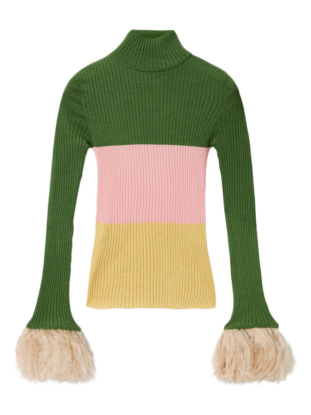 embroidered-logo feather-cuffs sweater Highlights - Green - Ribbed knit - Colour-block - High neck - Long sleeves - Feather trim Made in Italy Composition Cashmere 70%, Silk 27%, Ostrich Feather 3% Washing instructions Read Manufacturer Guidelines