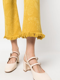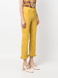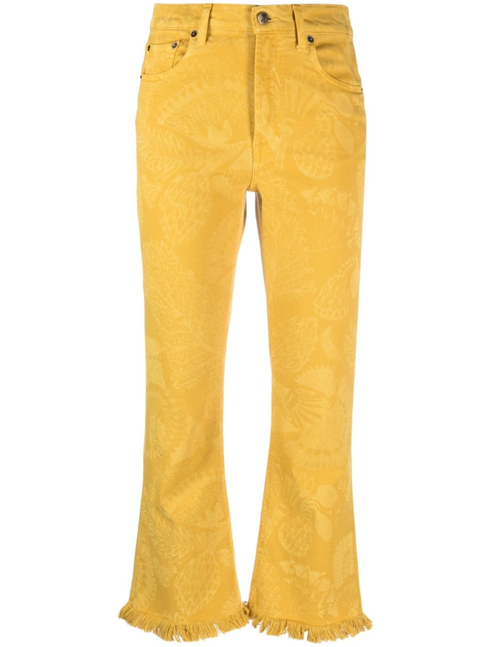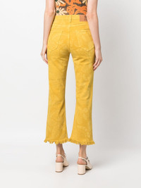 Fancy fringed cropped jeans These eye-catching jeans by La DoubleJ are laser-printed with the brand's charming Sycamore pattern. Rendered in a mustard-yellow hue and detailed with fringing at the hem, they are a fine example of the brand's ebullient approach to design. Highlights - Mustard yellow - Stretch-cotton - All-over floral print - Mid-rise - Belt loops - Button fly fastening - Slim cut - Fringe detailing - Cropped Made in Italy Composition Cotton 98%, Elastane 2% SIZE & FIT Model measurements Height 5 ft 10 in(1.78 m) Bust/Chest 31.49 in(80 cm) Hips 36.22 in(92 cm) Waist 25.59 in(65 cm) FittingInformation Designed with a flared hem, these jeans allow for a close fit at the waist with a slim fit over the leg and widening towards the hem Cropped in length Constructed from stretch denim, this piece offers a stretch fit with durability This piece fits true to size – take your usual size Washing instructions Machine Wash