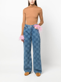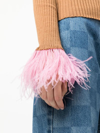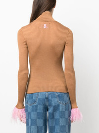feather-cuff ribbed-knit jumper La DoubleJ elevates this camel-brown ribbed-knit jumper with bright pink feather cuffs. The back is emboldened with an embroidered logo for a branded touch. Highlights - Camel brown - Cashmere-silk blend - Ribbed knit - Ostrich feather - Feather-trim detailing - High neck - Long sleeves - Embroidered logo to the rear - Straight hem Made in Italy Composition Cashmere 70%, Silk 27%, Ostrich Feather 3% SIZE & FIT Model measurements Height 5 ft 11 in(1.8 m) Bust/Chest 31.49 in(80 cm) Hips 36.22 in(92 cm) Waist 25.59 in(65 cm) FittingInformation Designed for a slim fit that sits just away from the body offering a close yet comfortable fit Made with a midweight knit, this piece offers some stretch This piece fits true to size – take your usual size Washing instructions Hand Wash
