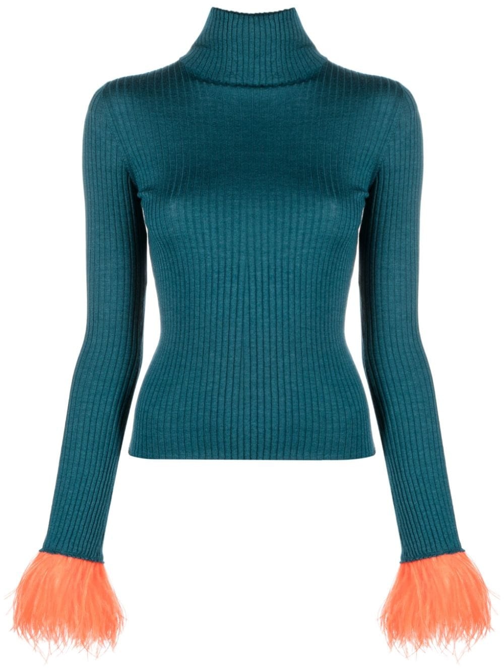 feather-trim rib-knit jumper Spun from a soft blend of cashmere and silk to a ribbed-knit construction, this petrol-blue jumper is punctuated with wispy feathered cuffs in a contrasting orange hue, encapsulating the brand's bold and vibrant aesthetic. Highlights - Petrol blue/carrot orange - Cashmere-silk blend - Ribbed knit - Roll neck - Long sleeves - Feather-trim detailing - Straight hem Made in Italy Composition Cashmere 70%, Silk 27%, Ostrich Feather 3% SIZE & FIT Model measurements Height 5 ft 10 in(1.77 m) Bust/Chest 31.1 in(79 cm) Hips 35.03 in(89 cm) Waist 23.62 in(60 cm) FittingInformation Designed for a slim fit that sits just away from the body offering a close yet comfortable fit Made with a midweight knit, this piece offers some stretch This piece fits true to size – take your usual size Washing instructions Machine Wash