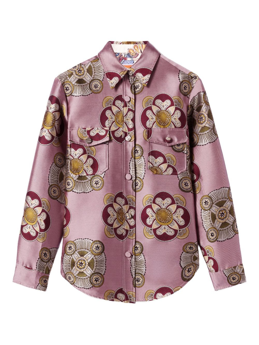 floral-print jacquard shirt jacket Highlights - Dusty pink - Floral print - Long sleeves - Button fastening - Flap pockets Made in Italy Composition Polyester 72%, Silk 28% Washing instructions Read Manufacturer Guidelines