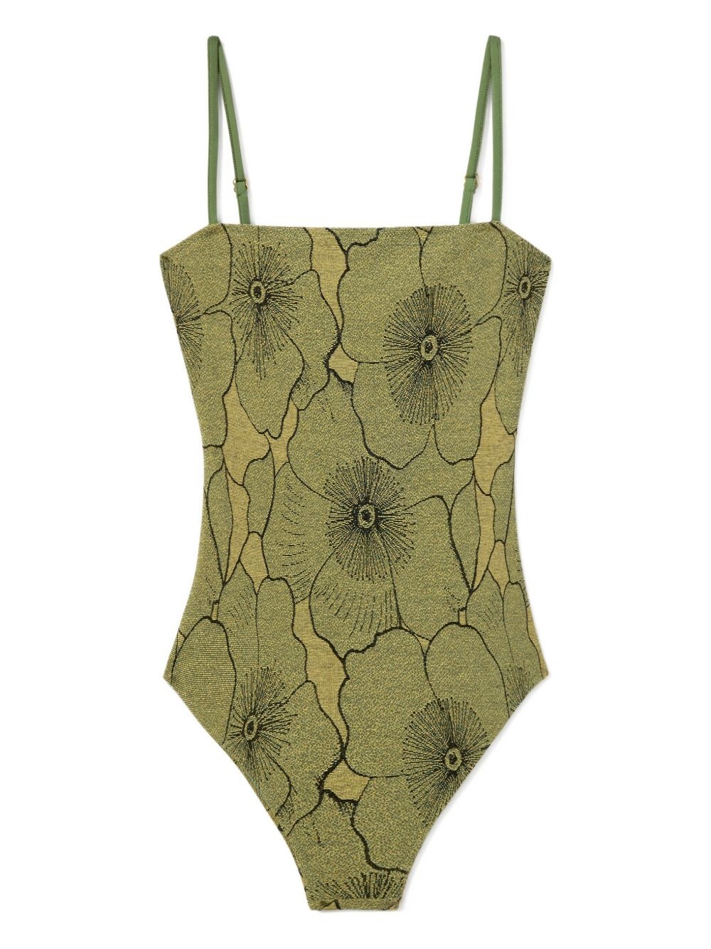 floral-print swimsuit Highlights - Olive green - All-over flower motif - Adjustable shoulder straps - Square neckline - Be mindful to try on swimwear over your own garments. Made in Italy Composition Viscose 66%, Polyamide 22%, Metal (Other) 9%, Elastane 3%