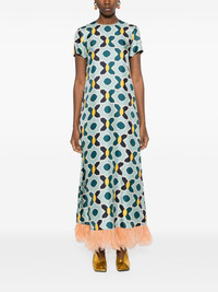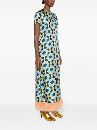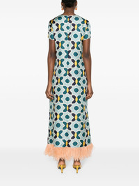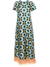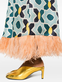 geometric-print silk swing dress Highlights - Blue/multicolour - Silk - Satin finish - Geometric-pattern print - Round neck - Rear zip fastening - Short sleeves - Shift style - Ostrich feather-trim - Ankle-length Made in Italy Composition Silk 98%, Ostrich Feather 2% SIZE & FIT Model measurements Height 5 ft 10 in(1.78 m) Bust/Chest 31.49 in(80 cm) Hips 37 in(94 cm) Waist 23.62 in(60 cm) Measurement SLEEVE LENGTH 6.29 in(16 cm) HIPS 40.15 in(102 cm) LENGTH 52.75 in(134 cm) WAIST 35.43 in(90 cm) FittingInformation Designed for a relaxed fit, this piece allows for comfort and movement when worn Made from a midweight non-stretch fabric This piece fits true to size – take your usual size Washing instructions Dry Clean Only
