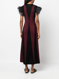 Harlequin intarsia-knit dress Leaning into a more subdued approach, La DoubleJ introduces the Harlequin dress. It is so-named because of its diamond-check intarsia knit construction, resembling the costumes of the comic servant characters from the Italian 'commedia dell'arte', a nod to the brand's roots. For a hint of drama, the cuffs are trimmed with fluttery ostrich feathers. Highlights - Burgundy - Merino wool - Checked intarsia knit - Feather-trim detailing - Round neck - Sleeveless - Flared skirt - Mid-calf length - Straight hem Made in Italy Composition Merino 100% SIZE & FIT Model measurements Height 5 ft 11 in(1.8 m) Bust/Chest 31.49 in(80 cm) Hips 35.82 in(91 cm) Waist 24.8 in(63 cm) FittingInformation Designed for a close fit throughout Made with a midweight knit, this piece offers some stretch This piece fits true to size – take your usual size Washing instructions Dry Clean Only