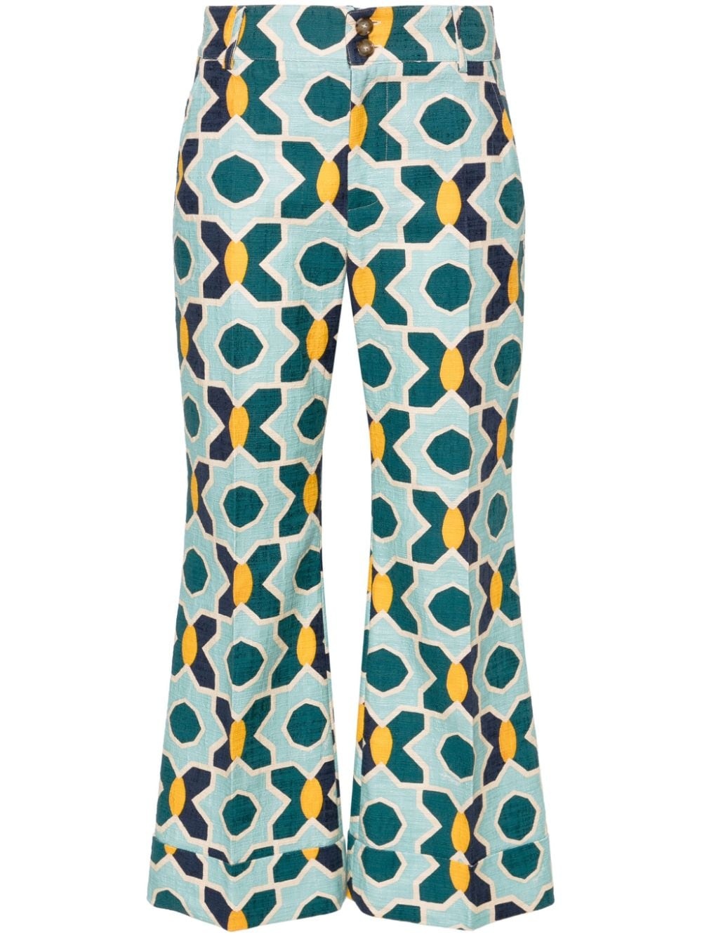 Hendrix jacquard tailored trousers Highlights - Blue/multicolour - Stretch-cotton - Geometric-patterned jacquard - Belt loops - Concealed front fastening - Straight leg - Two side slit pockets - Two rear welt pockets - Turn-up cuffs - Ankle-length Made in Italy Composition Outer: Cotton 97%, Elastane 3% Lining: Polyester 100% SIZE & FIT Model measurements Height 5 ft 11 in(1.8 m) Bust/Chest 34.25 in(87 cm) Hips 35.82 in(91 cm) Waist 24.8 in(63 cm) FittingInformation Designed with a flared hem, these trousers allow for a close fit at the waist with a slim fit over the leg and widening towards the hem Cropped in length Made from a midweight stretch fabric, this piece offers elasticity and flexibility when worn This piece fits true to size – take your usual size