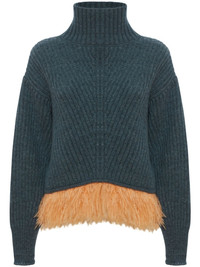 high-neck feather-trim jumper Highlights - Teal green - Alpaca wool-blend - Ostrich feather - Knitted construction - Applique logo - High neck - Drop shoulder - Long sleeves - Flared hem Made in Italy Composition Alpaca Wool 66%, Polyamide 22%, Merino 10%, Ostrich Feather 2% SIZE & FIT Measurement SLEEVE LENGTH 25.59 in(65 cm) LENGTH 21.25 in(54 cm) WAIST 36.22 in(92 cm) BUST 37 in(94 cm) Washing instructions Read Manufacturer Guidelines